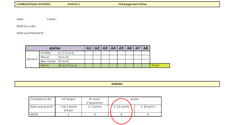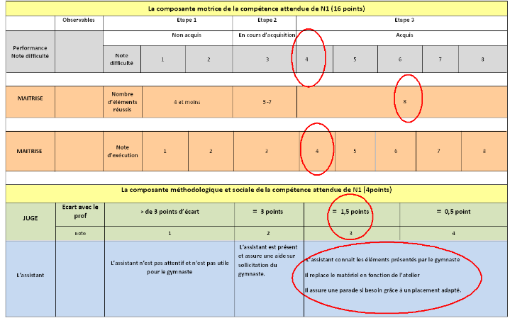 Pour le jugement, une marge d'erreur comprise entre 0 et 1,5 point sur l'exécution des éléments présentés par rapport au professeur et la reconnaissance du niveau de tous les éléments.