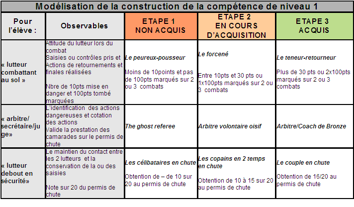 Toutefois au sol (les 2 lutteurs allongés) ce rapport de force semble s'inverser. C'est pourquoi lorsque nous envisageons le passage obligé « accepter la confrontation et maîtriser ses émotions », les élèves acquièrent les capacités de « se sentir en position de mise en danger ou de tombé, se défendre en se libérant du contrôle adverse et en revenant à plat ventre » afin d'adopter une attitude combative au sol en position de mise en danger.